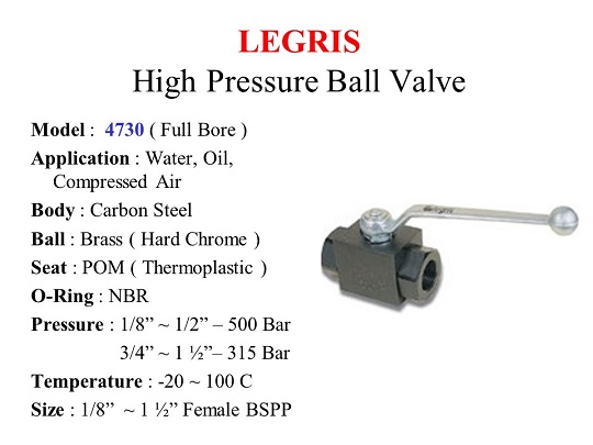 Jual Ball Valve tekanan tinggi untuk cairan Hidrolik, Air & Minyak dsb merek Legris dari Perancis. Standard eropa PN 315 ~ 500.