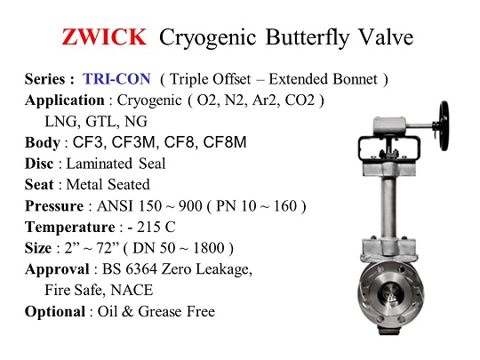 Zwick is World Reknown manufacturer of Triple Offset Butterfly Valves from Germany. Widely used in LNG, Cryogenic application like liquid O2, CO2, Ar2, N2.