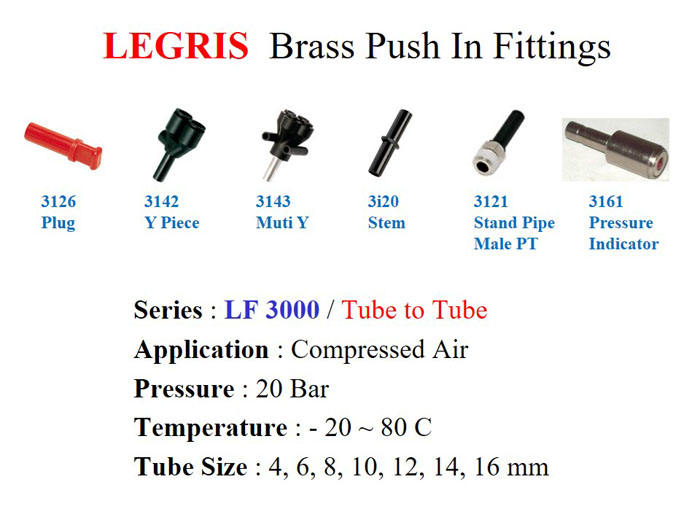 Jual Push-In Fittings merek Legris LF 3000 series / Brass body. Jenis Tube to Thread model : 3175, 3109, 3129, 3108, 3103, 3148, 3101, 3199, 3198, 3193, 3114, 7808.