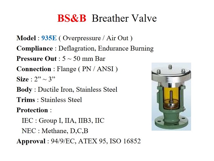 BS&B manufactures wide range of Breather Valves to protect Tank & other Equipment. BS&B 935E series is for Over Pressure application / Air Out.