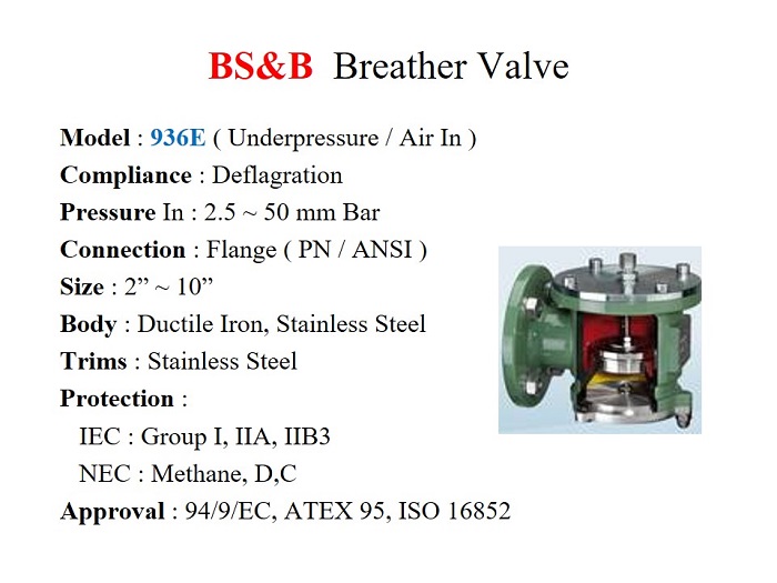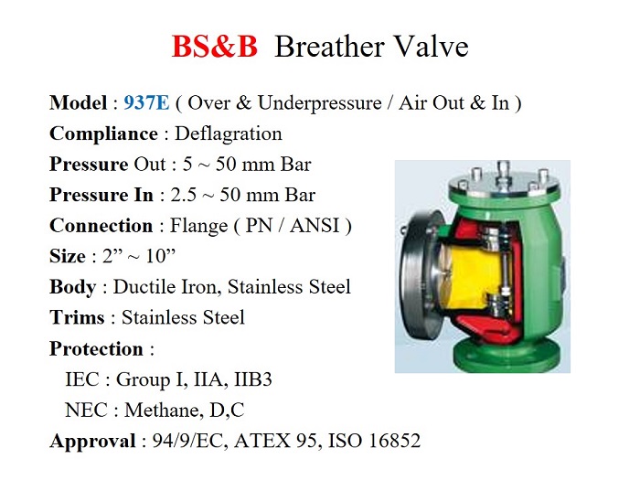 BS&B manufactures wide range of Breather Valves to protect Tank & other Equipment. BS&B 937E series is for both Air In & Air Out application