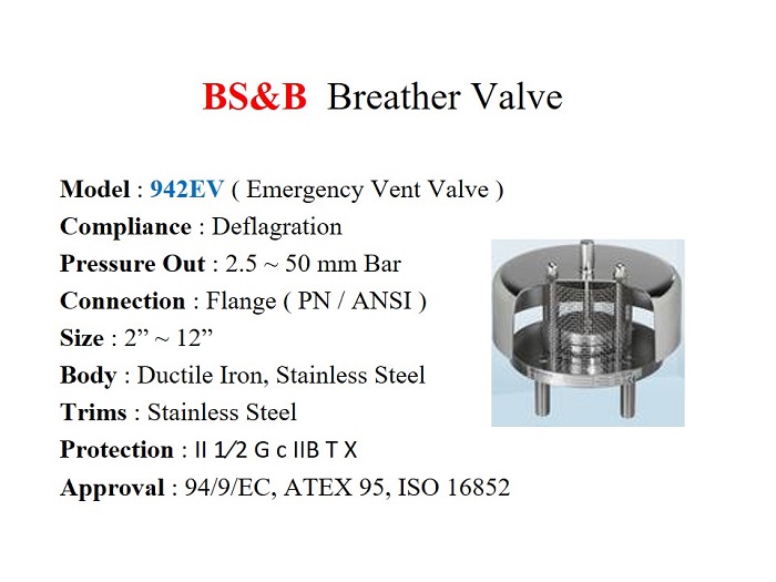 BS&B manufactures wide range of Breather Valves to protect Tank & other Equipment. BS&B 942EV series is for Overpressure application.