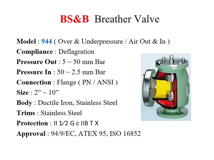 BS&B manufactures wide range of Breather Valves to protect Tank & other Equipment. BS&B 944 series is for both Over & Under Pressure.